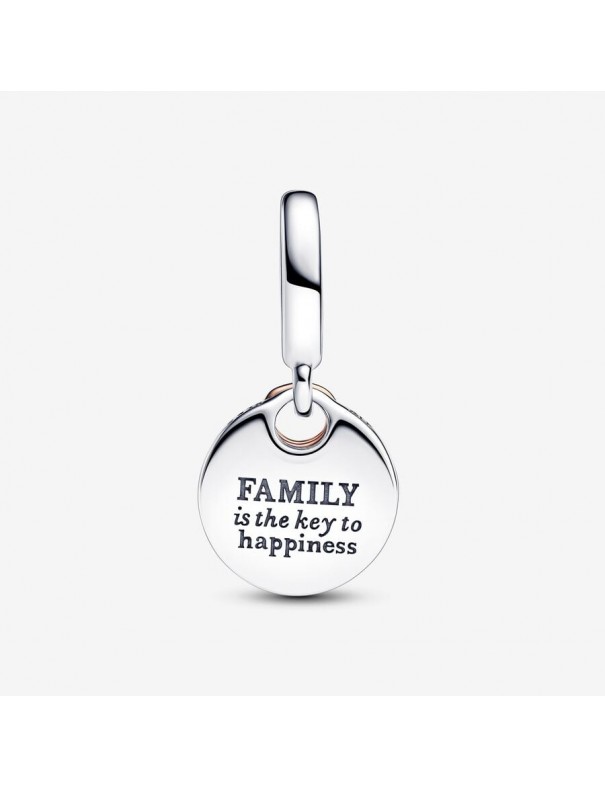Charm Pandora Colgante Doble Llave a la Felicidad 783236C01 fabricado en plata de ley 925 mls y el colgante de la llave recubierto en oro rosa de 14k, el disco colgante está adornado con circonitas en pavé y por la parte lleva la inscripción "FAMILY is the key of happiness" (la familia es la llave de la felicidad). Tiene tres años de garantía.