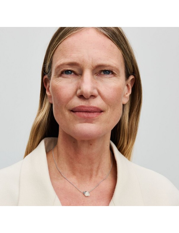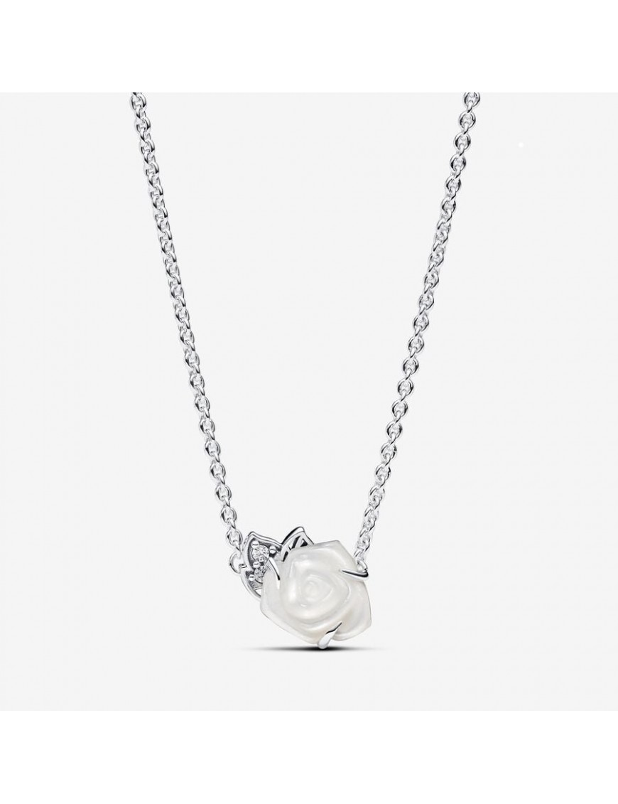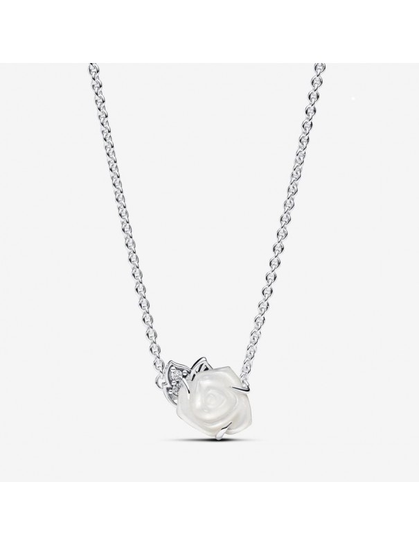 Collar Pandora Rosa Blanca Floreciendo 393206C01-45 fabricado en plata de primera ley 925 mls decorado con una rosa de madreperla artificial de bioresina blanca y circonitas.