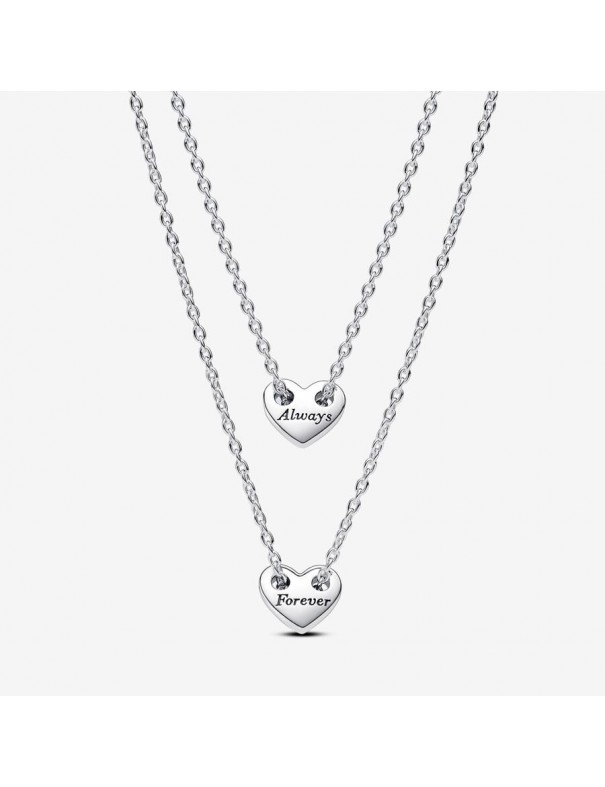 Collar Pandora Divisible Para Siempre 393207C00-45 fabricado en plata de primera ley 925 mls, son dos collares independientes con forma de corazón. Cada uno se ha decorado con las inscripciones "Always" y "Forever" (Por siempre y para siempre). Mide 45 cm de largo.