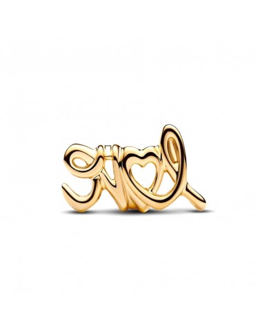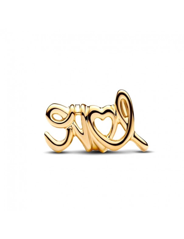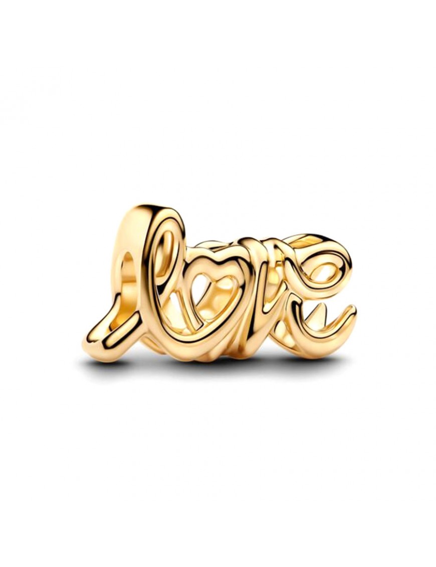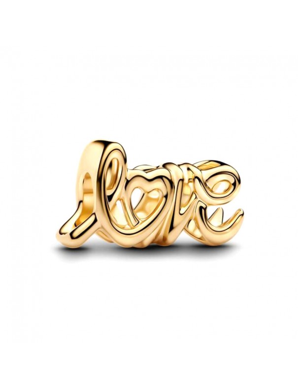 Charm Love Escrito a Mano 763055C00. Fabricado con una aleación de metales y un recubrimiento de oro de 14k, presenta la palabra "love" con letras de filigrana en la que la letra O tiene forma de corazón. Garantía de 3 años.