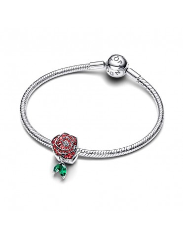Charm Rosa Floreciendo Brillante 793201C02. Charm en forma de rosa fabricado en plata de primera ley decorado con cristales artificiales en color rojo y dos gemas verdes colgando dando forma a dos hojas. Garantía de 3 años.