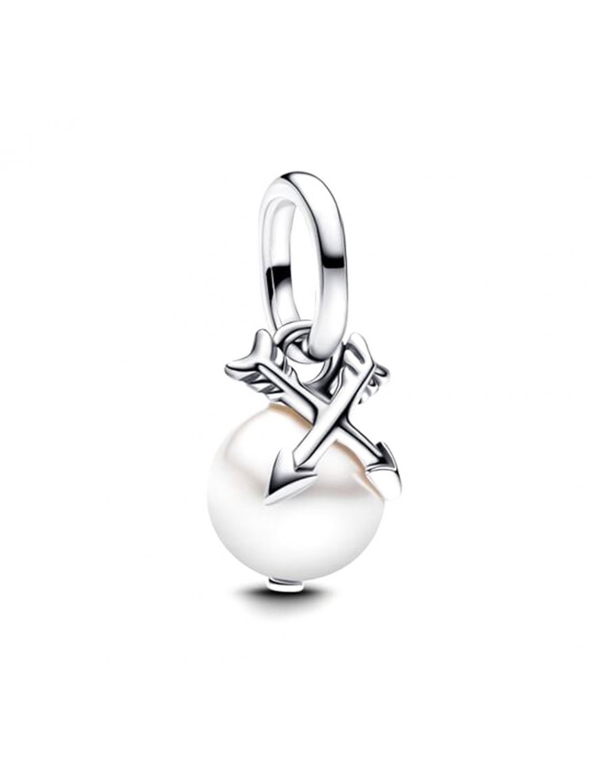 Charm Mini Colgante Pandora ME Perlas y Flechas 793687C01. Fabricado con plata de primera ley y con una perla lacada artificial con forma redonda decorada con dos flechas de cupido cruzadas. Garantía de 3 años.