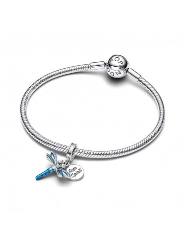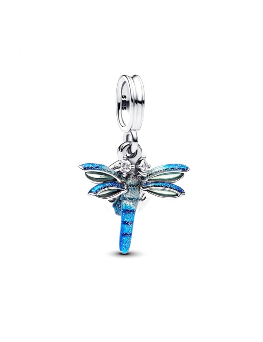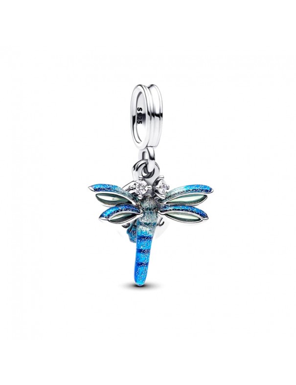 Charm Colgante Doble Libélula 793745C01. Fabricado en plata de primera ley en forma de libélula decorada con esmalte holográfico brillante. Presenta brillantes en los ojos y tiene una chapa en la que está inscrito "Free Spirit" (Espíritu Libre).