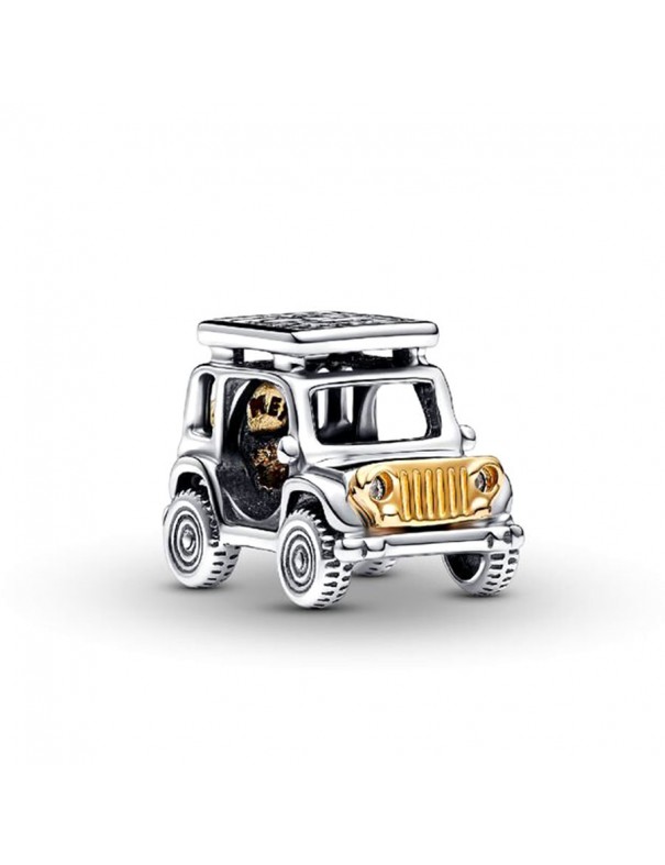 Charm Coche Aventuras en Dos Tonos 763330C01. Charm fabricado en plata de primera ley con detalles en recubrimiento de oro de 14k. Decorado con circonitas cúbicas en las luces y la palabra “ADVENTURE” en la capota, representa un coche con acabados realistas y mensaje grabado sobre la felicidad de viajar.