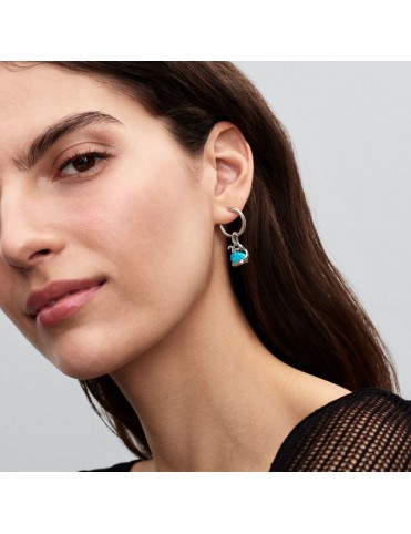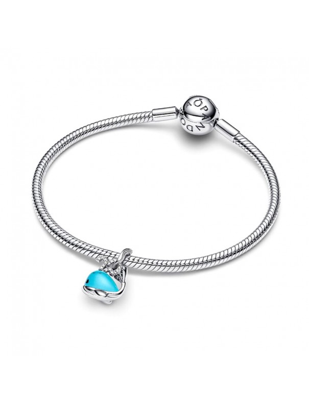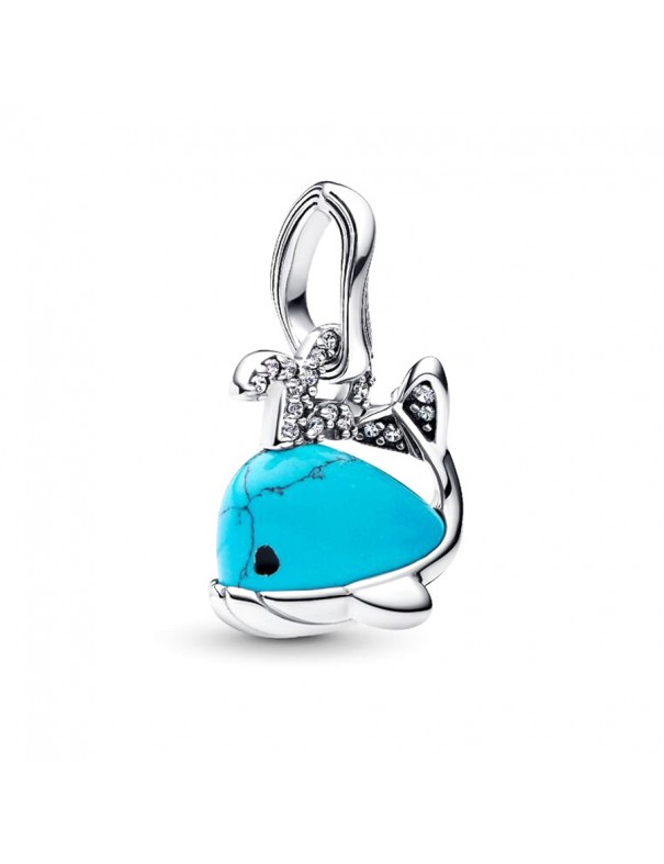 Charm Colgante Ballena Color Turquesa 793822C01. El charm está fabricado en plata de primera ley, decorado con circonita cúbica, esmalte aplicado con precisión e imitación de turquesa que reproduce su característico tono azulado. Su diseño en forma de ballena simboliza sabiduría y poder, acabado a mano con detalles ondulados y ojos expresivos. Compatible con Pandora ME y Moments.