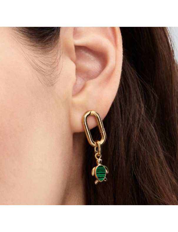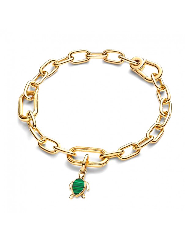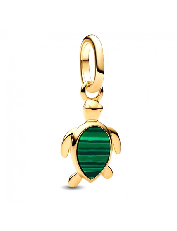 Charm Pandora Mini Colgante Tortuga Verde 763823C01. Charm mini colgante en forma de tortuga, con recubrimiento en oro de 14k, adornado con malaquita sintética de color verde intenso. Los detalles intrincados de la tortuga simbolizan longevidad y paciencia, añadiendo un toque elegante y simbólico.