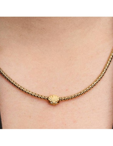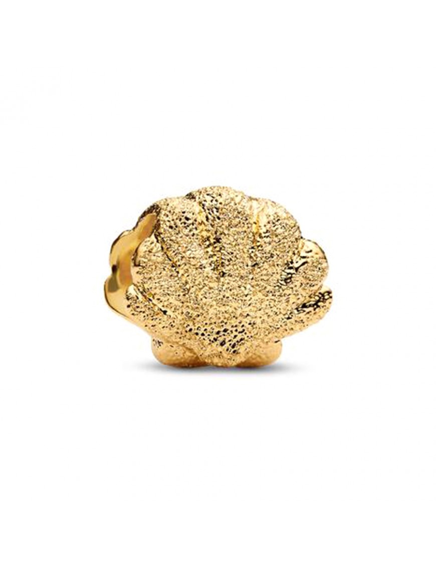 Charm Pandora Mini Concha Textura 764057C00. Fabricado con recubrimiento en oro de 14k, decorado con textura de punta de diamante que aporta brillo y detalle. Representa descubrimiento, fortaleza y la belleza que se encuentra bajo la superficie.