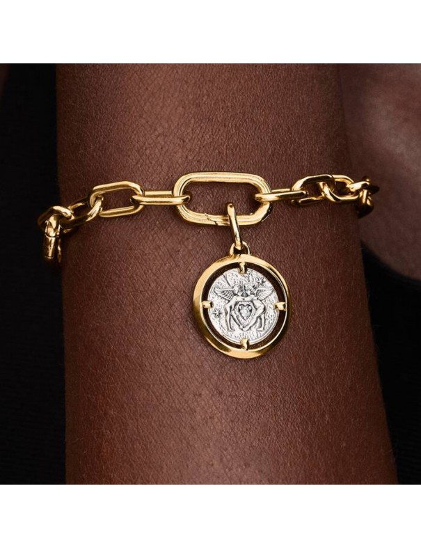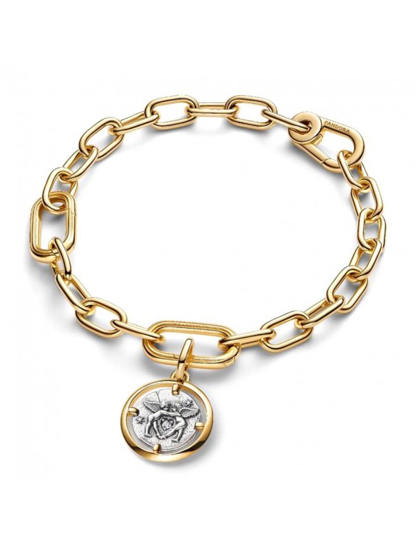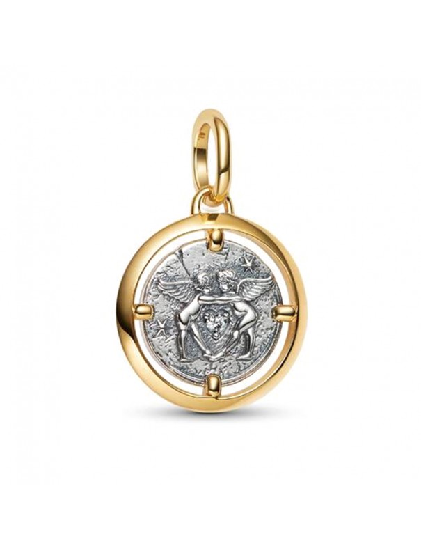 Charm Pandora Talismán Medallón Cupidos 764088C01. Fabricado en plata de primera ley con recubrimiento en oro de 14k, decorado con circonitas cúbicas que aportan un brillo delicado. Presenta la inscripción en latín “Amor Fati”, recordando aceptar y celebrar el destino.