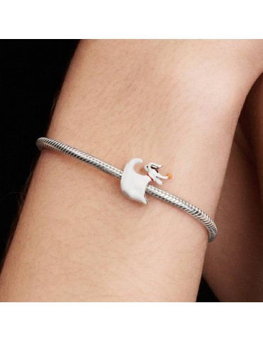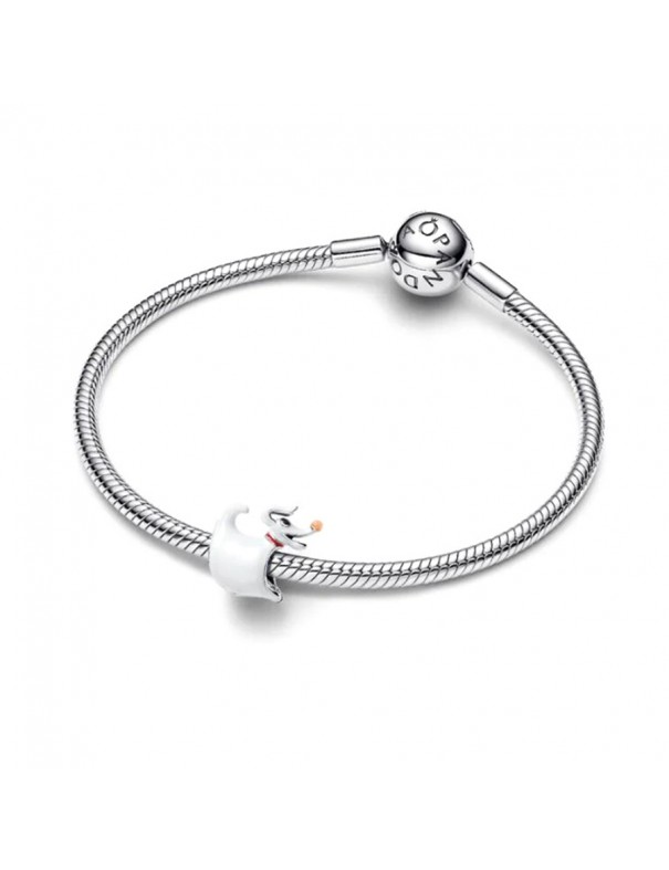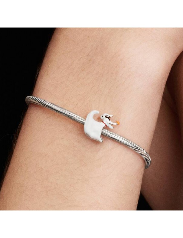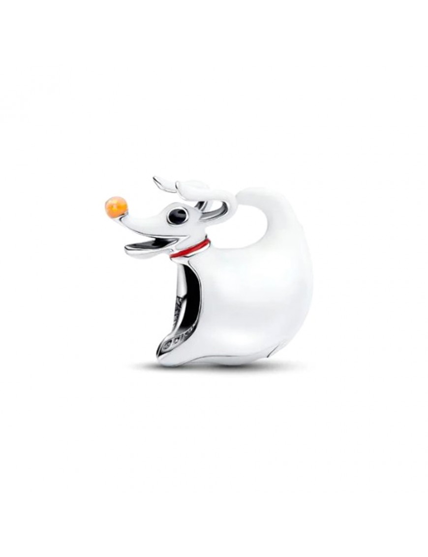 Charm Pandora Perro Zero de Pesadilla antes de Navidad de Disney 794026C01. Fabricado en plata de ley 925, este charm está rematado con esmalte blanco que brilla en la oscuridad, sin piedras añadidas, aportando un contraste juguetón entre el brillo de la plata y el color fantasmagórico del esmalte.