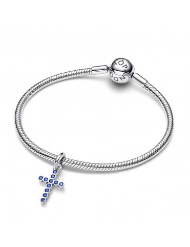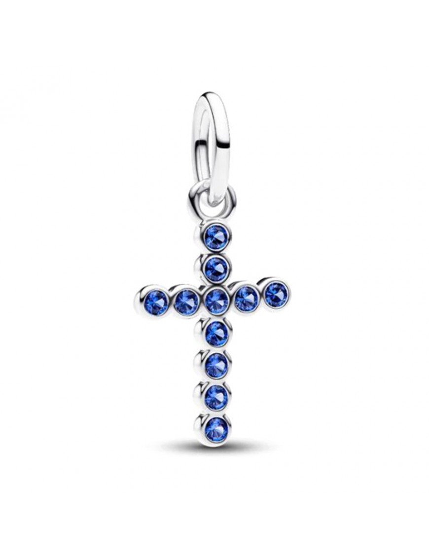 Charm Pandora Colgante Cruz 794063C01. Fabricado en plata de ley 925 con acabado pulido plateado, presenta una cruz adornada con cristales sintéticos azules que aportan brillo y simbolizan esperanza y fe. Ideal para llevar sola o combinada con otros charms.