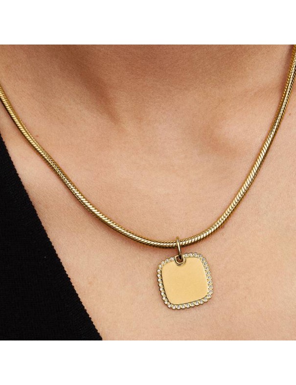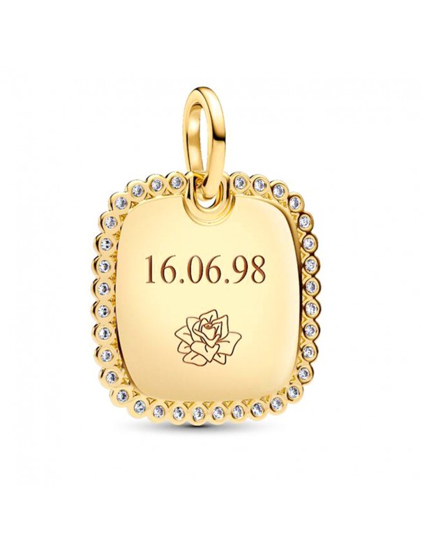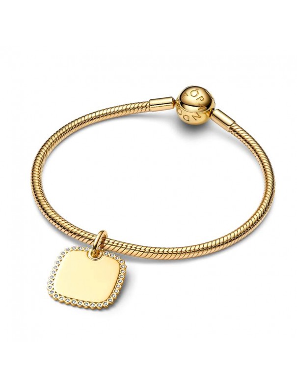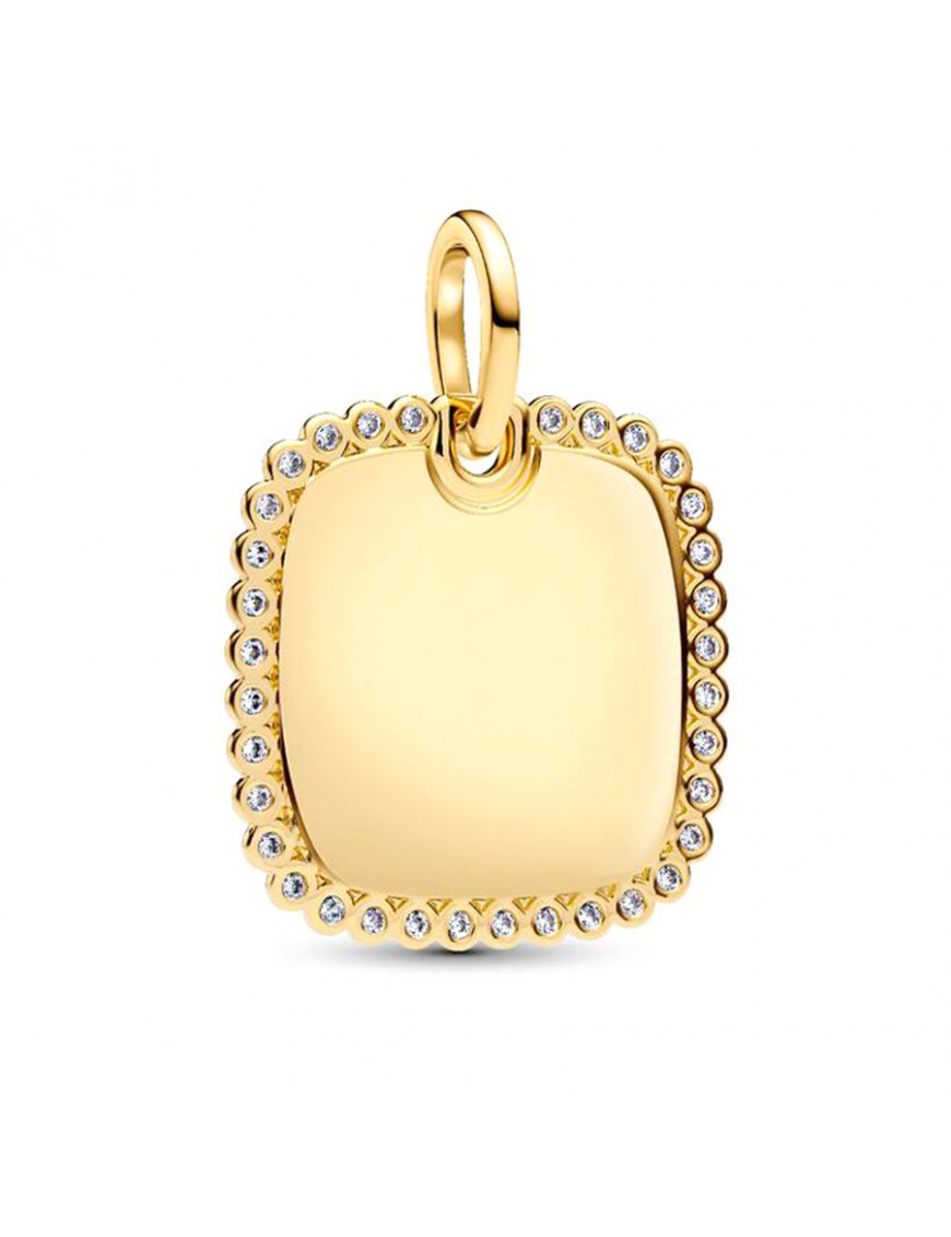 Colgante Pandora Etiqueta Grabable Cuadrada Brillante 364009C01. Fabricado en aleación metálica con acabado bañado en oro de 14 k, este colgante cuadrado dorado presenta un borde engastado con circonitas cúbicas blancas y su superficie lisa está pensada para grabados personales.