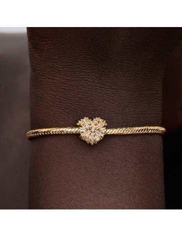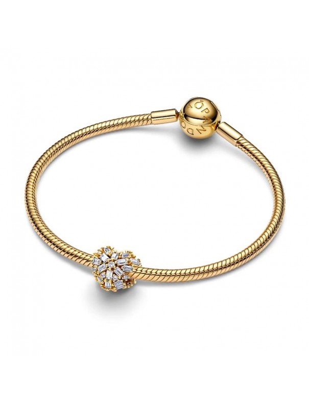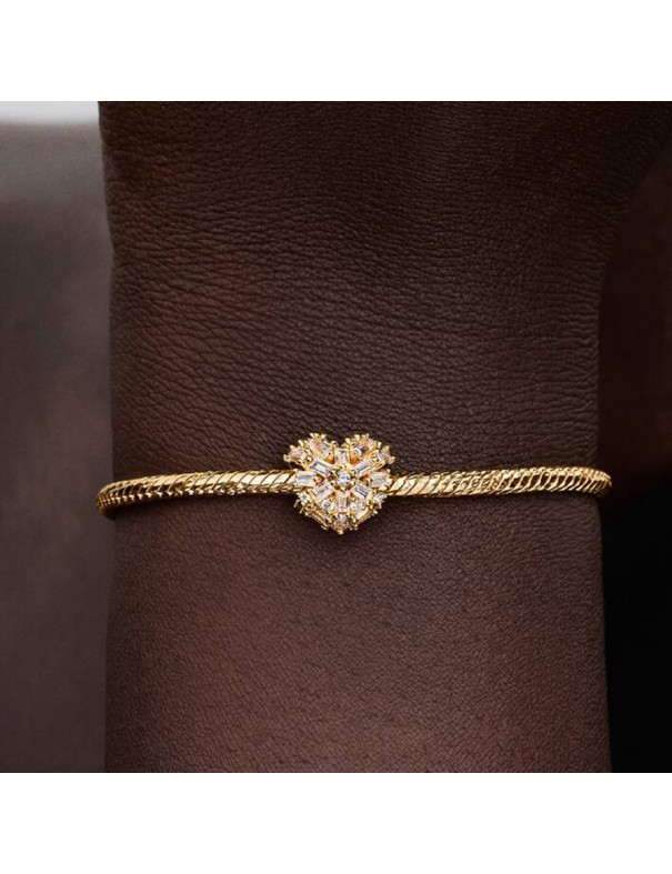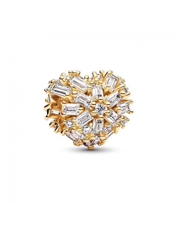 Charm Pandora Corazón Brillante 764240C01. Charm en forma de corazón elaborado en metal con un recubrimiento en oro de 14k. Su superficie está adornada con circonitas cúbicas transparentes que reflejan la luz con un brillo intenso. Un diseño elegante que simboliza amor y calidez.