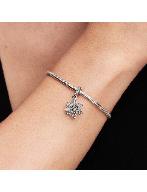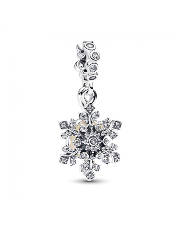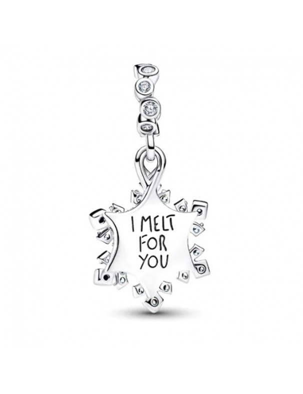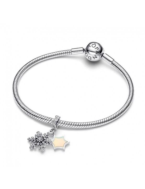 Charm Pandora Colgante Doble Copo de Nieve Opalescente 794142C01. Charm colgante doble en plata de primera ley con diseño de copo de nieve y estrella. Combina circonitas cúbicas transparentes con resina de ópalo creado en laboratorio, que irradia tonos iridiscentes. Un toque invernal lleno de brillo y un mensaje grabado: “I MELT FOR YOU”.