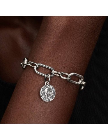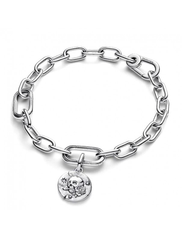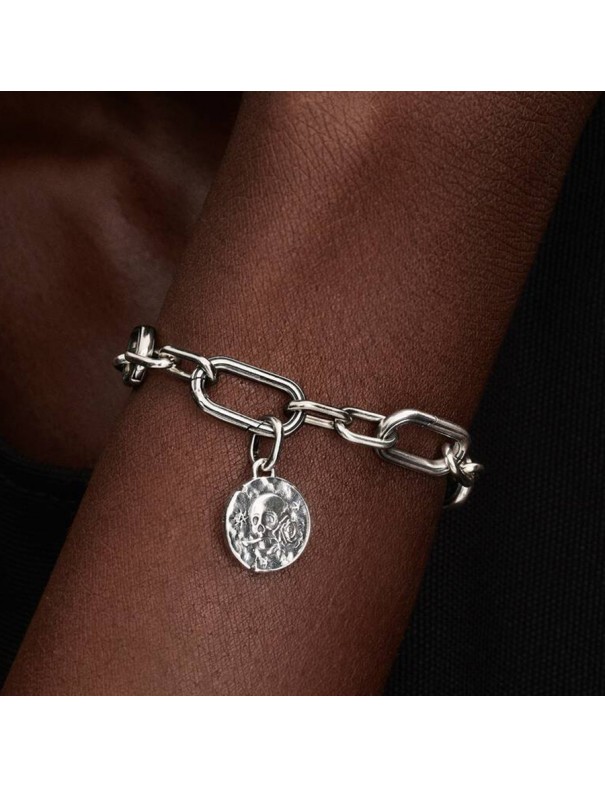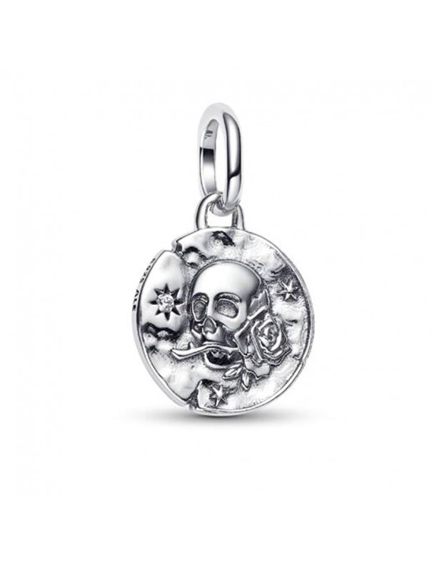 Charm Pandora Talismán Medallón Calavera 794089C01. Charm medallón fabricado en plata de ley 925 reciclada, color plateado, con un diseño de calavera y una rosa, y decorado con circonitas cúbicas blancas. Tiene un acabado envejecido de inspiración vintage y en su reverso está grabada la frase “CARPE DIEM” (“vive el momento”).