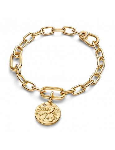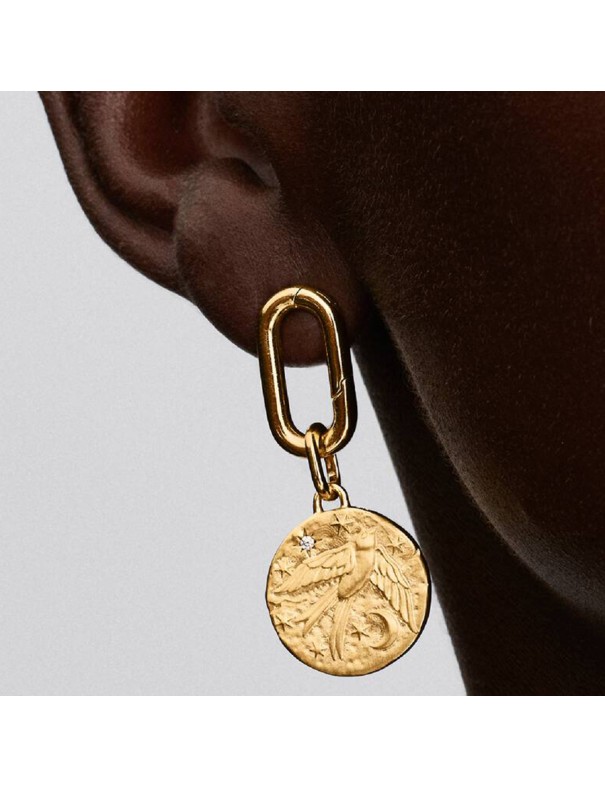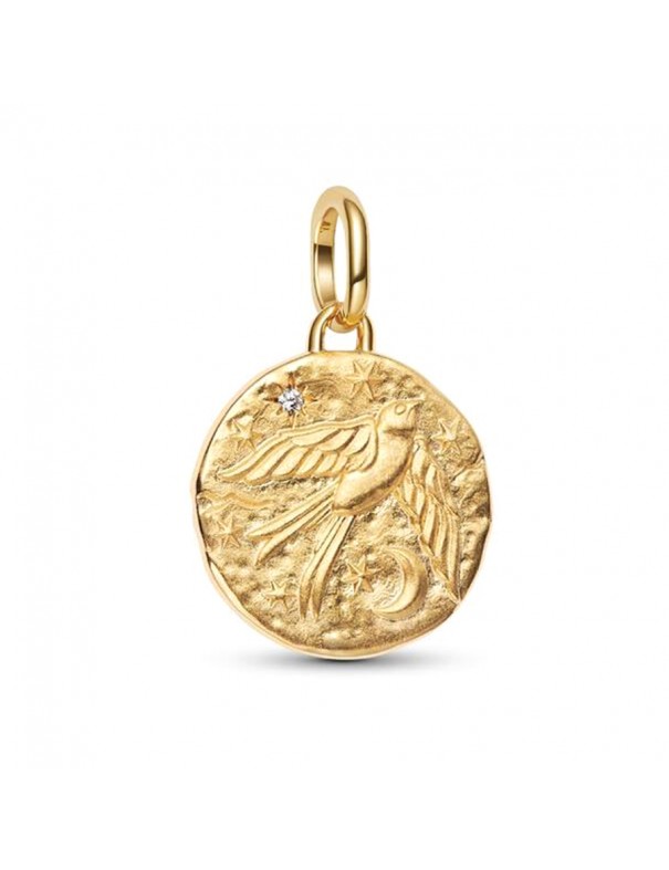 Charm Pandora Talismán Medallón Golondrina 764082C01. Fabricado en plata de ley 925 con chapado en oro de 14 k, de color dorado, decorado con una circonita cúbica blanca y un diseño de golondrina, luna y estrellas. En su reverso lleva grabada la frase en latín “DUM VITA EST SPES EST” (“donde hay vida, hay esperanza”). Es compatible con las colecciones Pandora ME y Moments.
