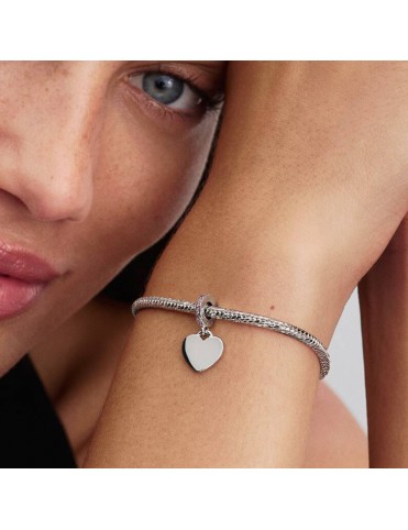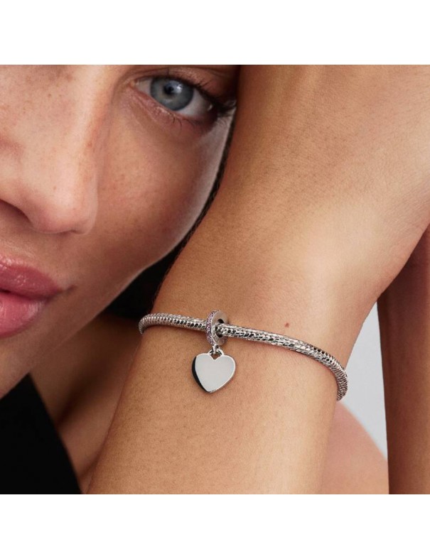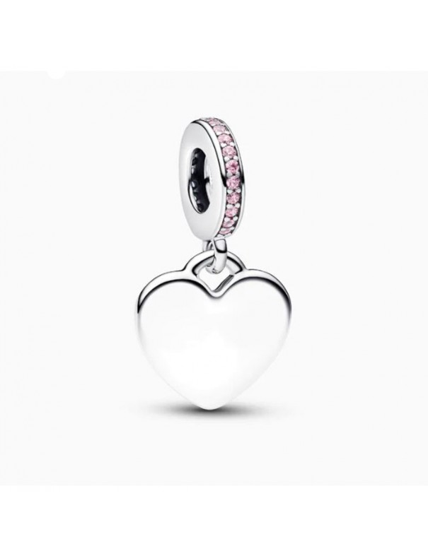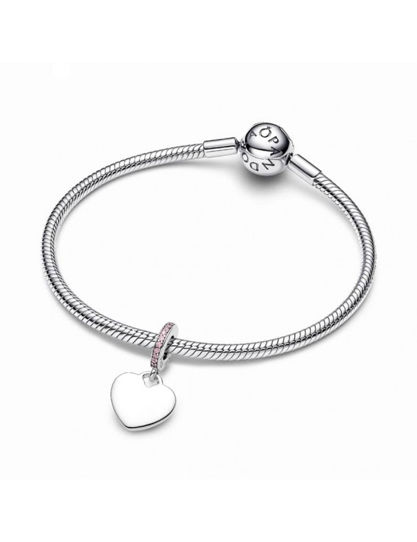 Charm Pandora Colgante Corazón Grabable Rosa 793926C02. Tiene forma de corazón y está hecho en plata de primera ley de color plateado con un toque delicado. Está adornado con una circonita cúbica rosa, que aporta un brillo sutil, ideal para personalizar con un grabado.