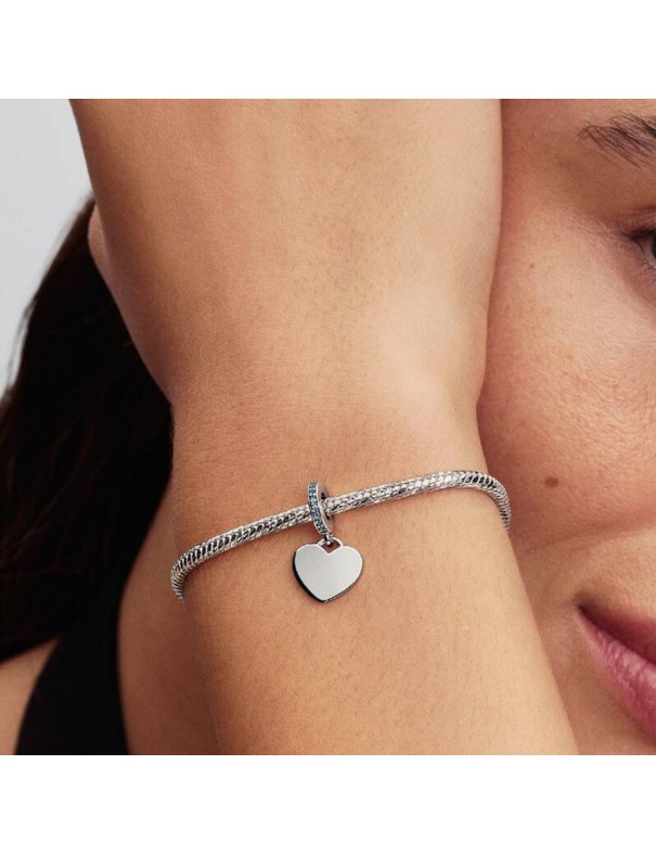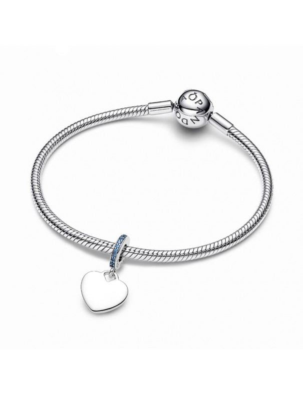 Charm Pandora Colgante Corazón Grabable Azul 793926C03. Tiene forma de corazón y está hecho en plata de primera ley de color plateado con un toque delicado. Está adornado con una circonita cúbica azul, que aporta un brillo sutil, ideal para personalizar con un grabado.