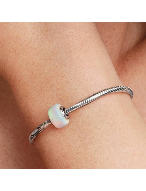 Charm Pandora Opalescente 794245C01. Diseño cilíndrico fabricado en plata de primera ley, de color plateado con una superficie central de resina de ópalo creado en laboratorio (efecto aurora boreal) que refleja tonos blancos y multicolores (rosados, verdes y azules) según la luz.