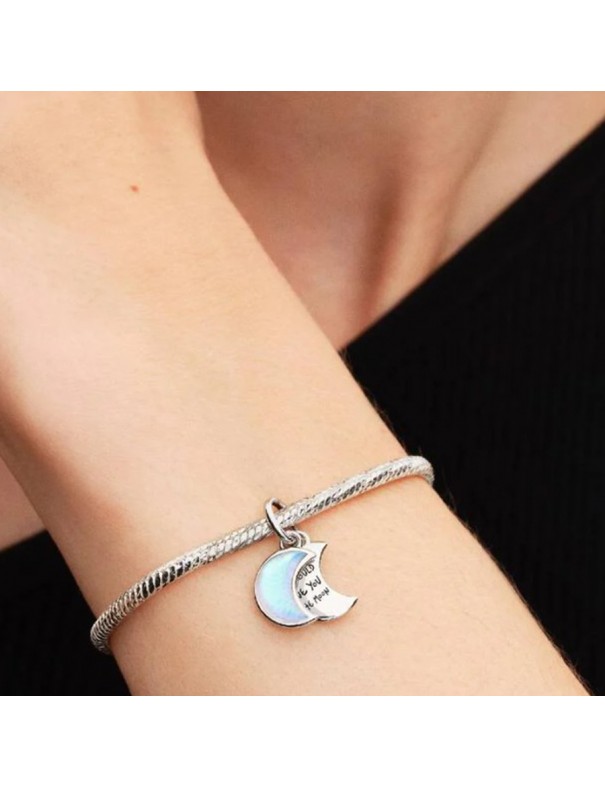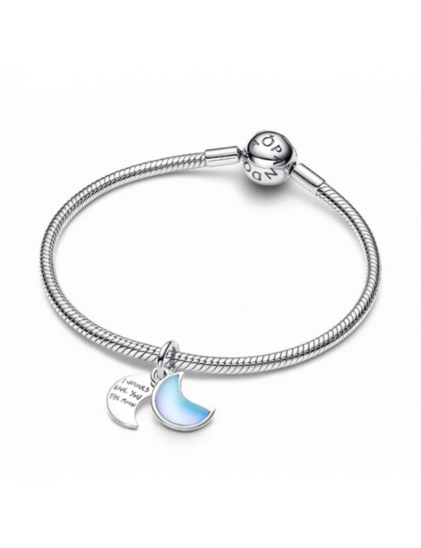 Charm Pandora Doble Luna Creciente 794272C01. Fabricado en plata de ley 925 de color plateado. Incluye dos motivos de luna creciente; uno está realizado con cristal iridiscente tipo piedra luna que refleja tonos sutiles y el otro tiene un grabado con mensaje emotivo, aportando un toque especial.