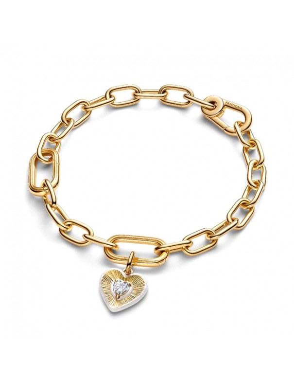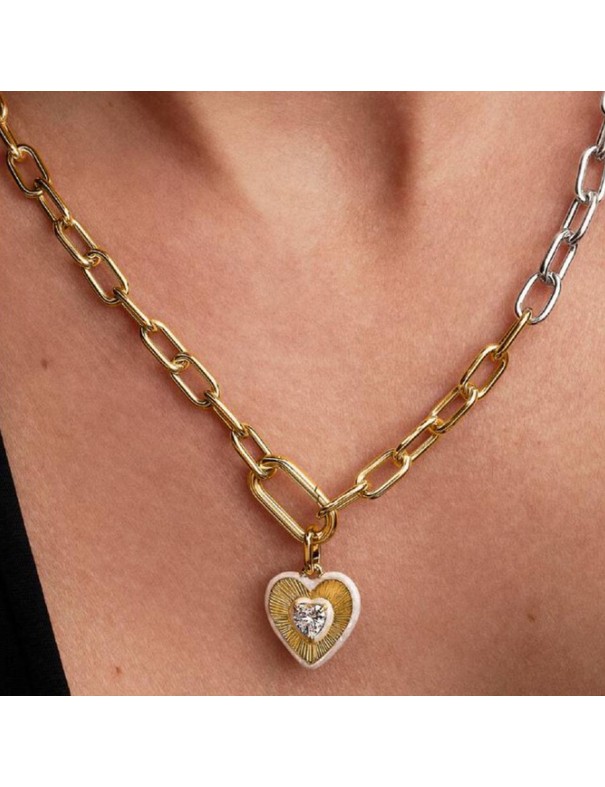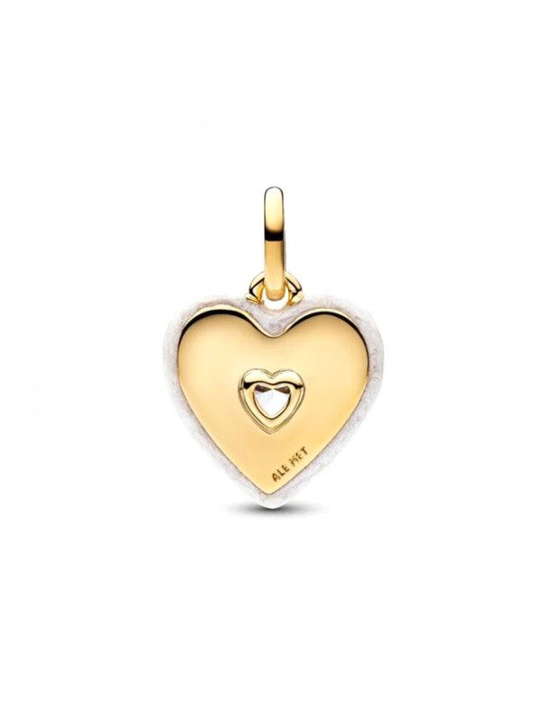Charm Pandora Medallón Corazón Radiante Blanco 764409C01. Charm colgante con forma de corazón de la colección Pandora ME, hecho en una aleación de metales con baño de oro de 14 k y detalles en esmalte blanco alrededor del motivo central. Tiene una piedra cúbica de circonita brillante en el centro que aporta un toque elegante y luminoso.