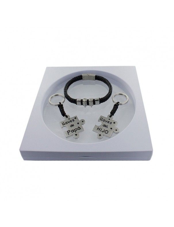 Pack pulsera de cuero + 2 llaveros puzzle padre e hijo 9106575. Es una pulsera perfecta para el día del padre, elaborada en cuero color negro y decorada con toques de acero. La medida de la pulsera es de 7 milímetros. Los dos llaveros son dos piezas de puzzle que se unen en uno "LLaves de Papá" y la otra "Llaves del Hijo". Un detalle que siempre ira con ellos