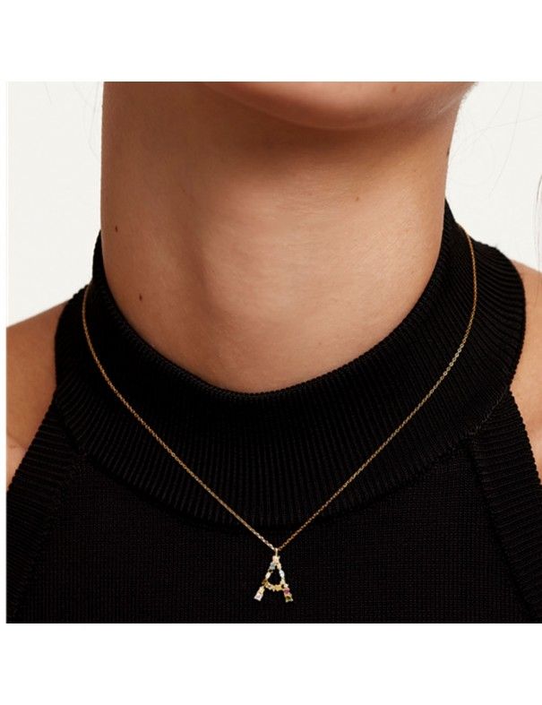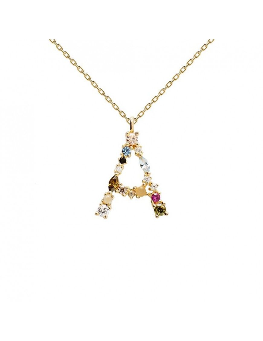 Collar Letra A PDPAOLA CO01-096-U, en plata de primera ley 925mls y baño en oro de 18Kts. Cadena ajustable 35-50cm, cierre de mosquetón. Letra de 17X12mm decorada con circonitas de colores.