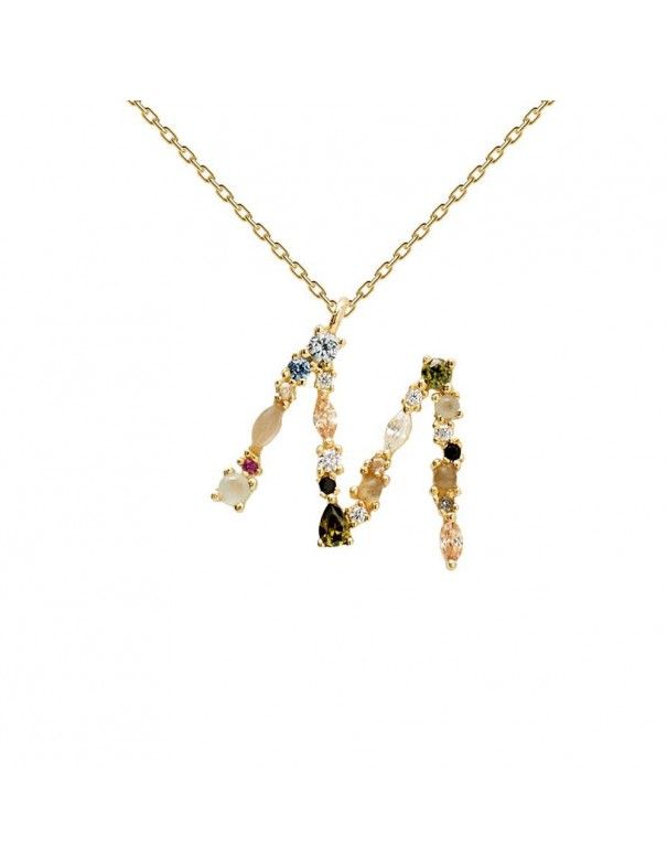 Collar Letra M PDPAOLA CO01-108-U, en plata de primera ley 925mls y baño en oro de 18Kts. Cadena ajustable 35-50cm, cierre de mosquetón. Letra de 17X15mm, decorada con circonitas de colores.