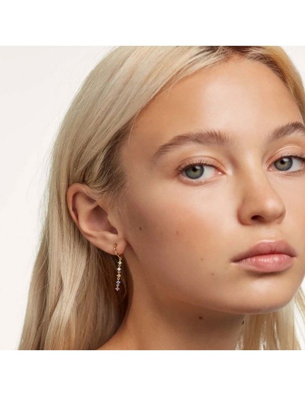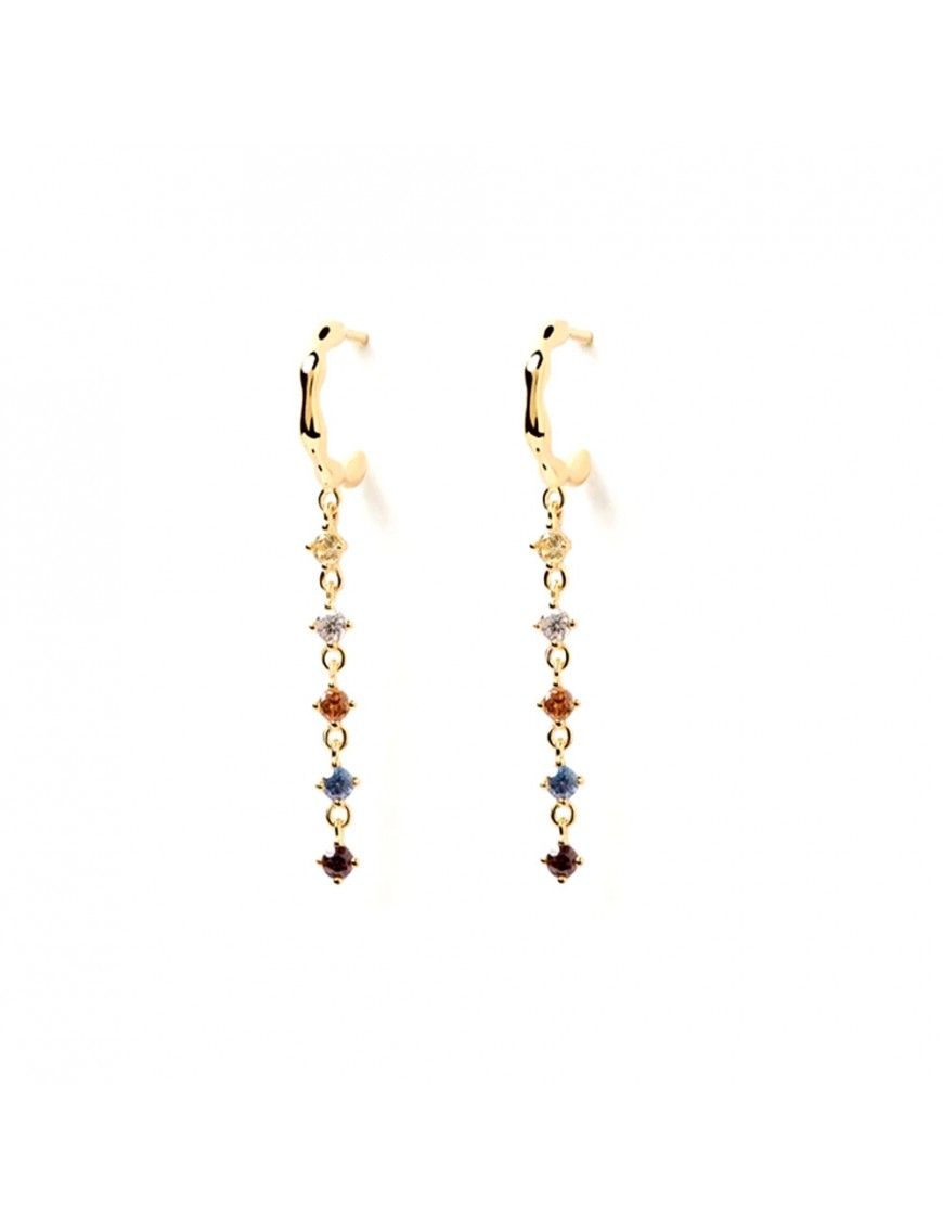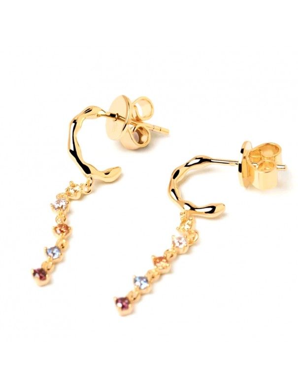 Pendientes PDPAOLA Sage Gold AR01-303-U, en plata de primera ley 925mls bañado en oro de 18kts. Piedras: corindón zafiro azul, circonita rodelita, circonita champagne, circonita amarillo dorado y circonita blanco puro. Aro de 11mm de diámetro. Cierre de presión.