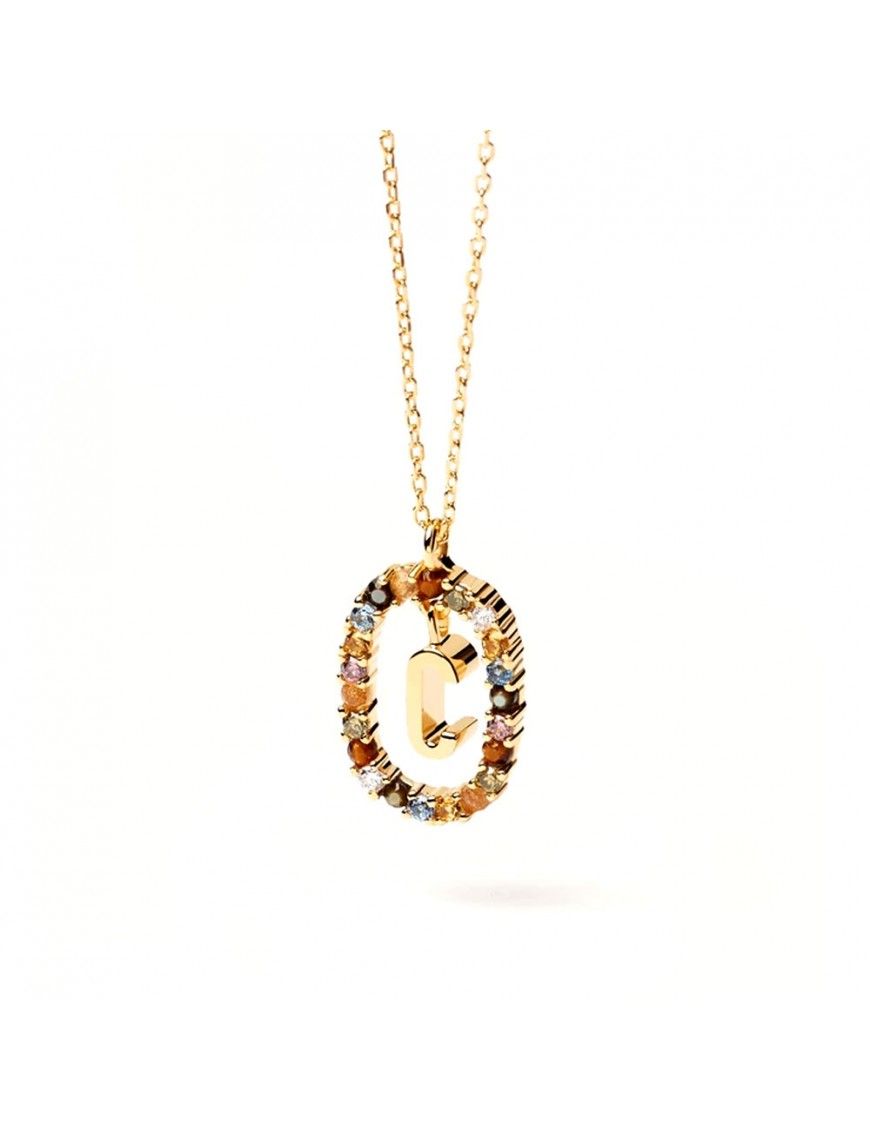 Collar Inicial PDPAOLA CO01-262-U, en plata de primera ley 925mls bañado en oro de 18kts. Piedras: ojo de tigre, labradorita, nácar con cristal, cristal amarillo dorado, cristal verde peridoto, cristal verde oliva, cristal azul espinela, cristal violeta rodolita, cristal azul espinela, cristal violeta rodolita y cristal blanco puro. Óvalo de 10,5X15mm. Letra de 6.5X3mm. Cadena ajustable de 40 a 50cm. Cierre de mosquetón.
