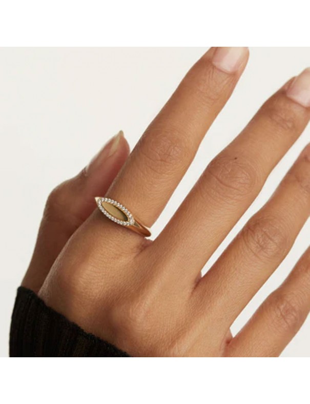Anillo PdPaola Sello Lace AN01-629-12. Es de plata de primera ley de 925 mls con baño de oro de 18 kts y circonitas. Es de la talla 12. Garantía de tres años.