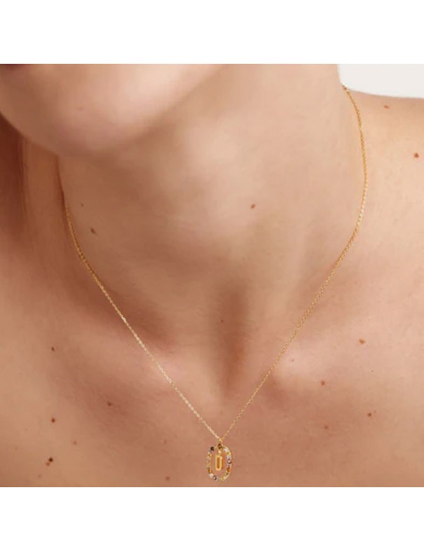 Collar PdPaola Letra D para mujer CO01-263-U. Está fabricado en plata de primera ley de 925 mls con baño de oro de 18 kts y piedras semipreciosas. Mide 45 cm de largo.