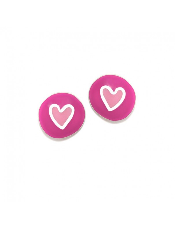 Pendientes Corazón Agatha Ruiz de la Prada para niña 030FUN. Son de plata de primera ley de 925 mls. Decorados con esmalte rosa fucsia. Llevan cierre de presión y mide 7 mm de alto. Tres años de garantía contra defecto de fabricación.