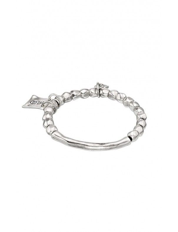 Pulsera Uno de 50 para mujer, modelo PUL1209MTL0000M. Se trata de una pulsera de cuentas y una pieza tubular de metal bañado en plata, en el colgante de esta pulsera está escrita la palabra 'salud'. Cuenta con una garantía de 2 años, del mismo fabricante. Se puede realizar el envío adjuntando un envoltorio especial para regalo, gratuitamente.