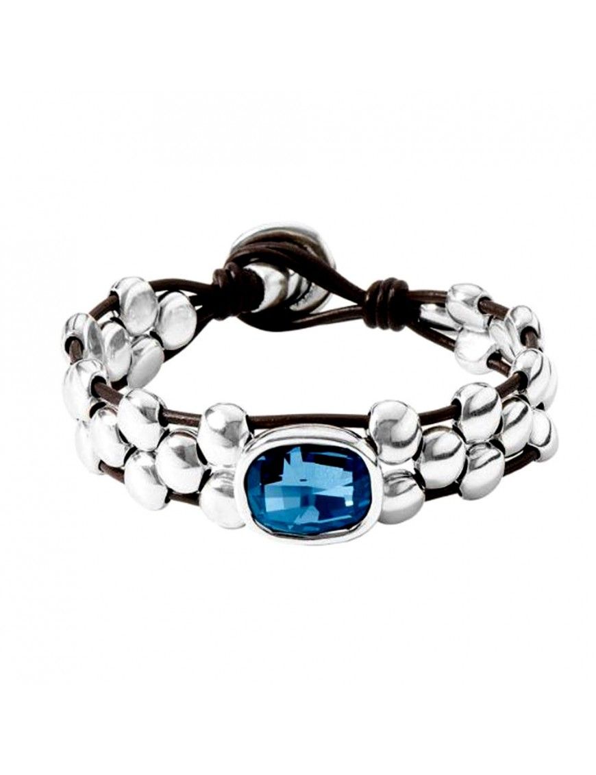 Pulsera Uno De 50 Hey You PUL2017AZUMTL0M, en metal bañado en plata. Pertenece a la colección Ecstasy. Compuesta por tres tiras de cuero color marrón decoradas con lentejas plateadas. Motivo central con cristal de Swarovski color Denim Blue. Longitud de 15,5cm. Cierre de botón.