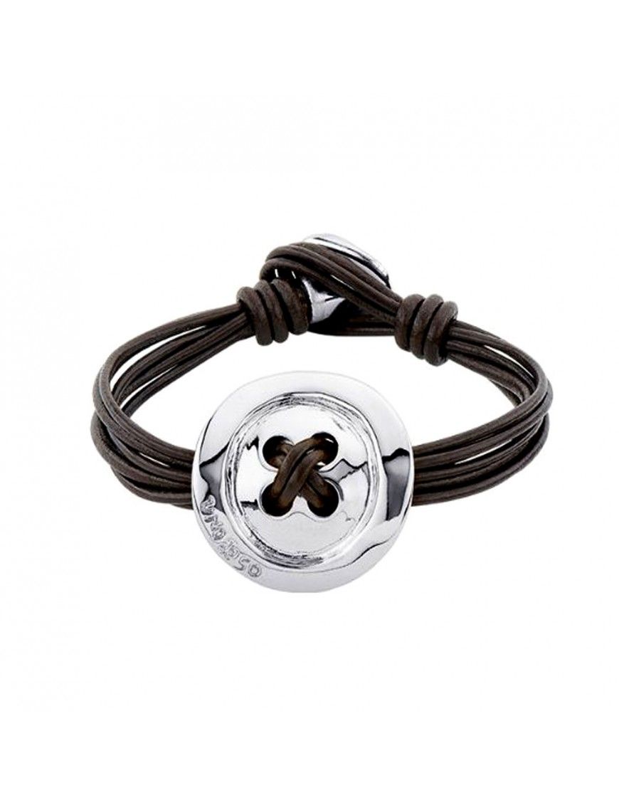 Pulsera Uno De 50 See You PUL2012MARMTL0M, de metal bañado en plata. Compuesta por varias tiras de cuero color marrón y decorada en el centro con motivo en forma de botón. Cierre tipo botón.