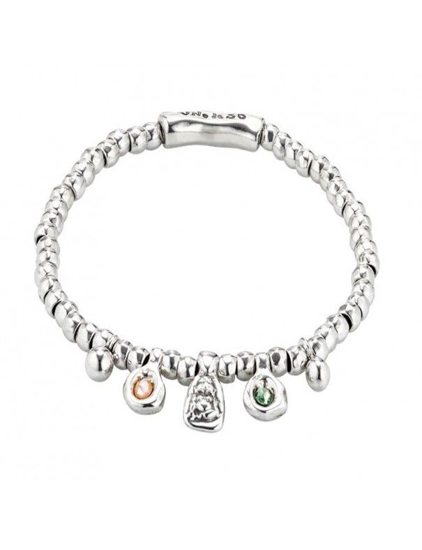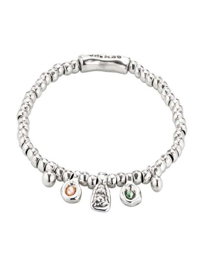 Pulsera Uno De 50 BoyGirl PUL1970MCLMTL0M, de metal bañado en plata, decorada con cristales facetados en color rosa y verde. Elástica de 15cm de diámetro.