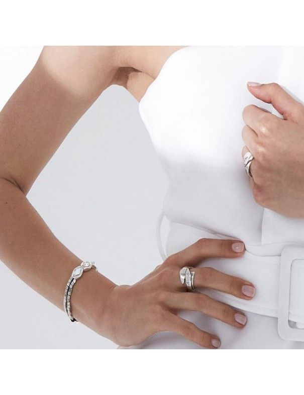 Pulsera Uno De 50 Mystery PUL2101TRAMTL0M, de metal bañado en plata, decorado con cristales facetados blancos y dos tiras de pasadores mini carré, con abalorios hexagonales. Cierre mediante botón.