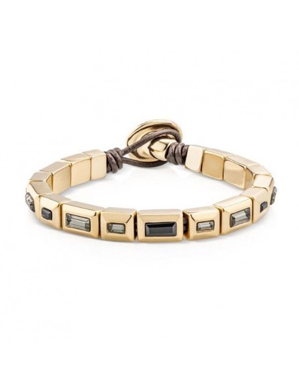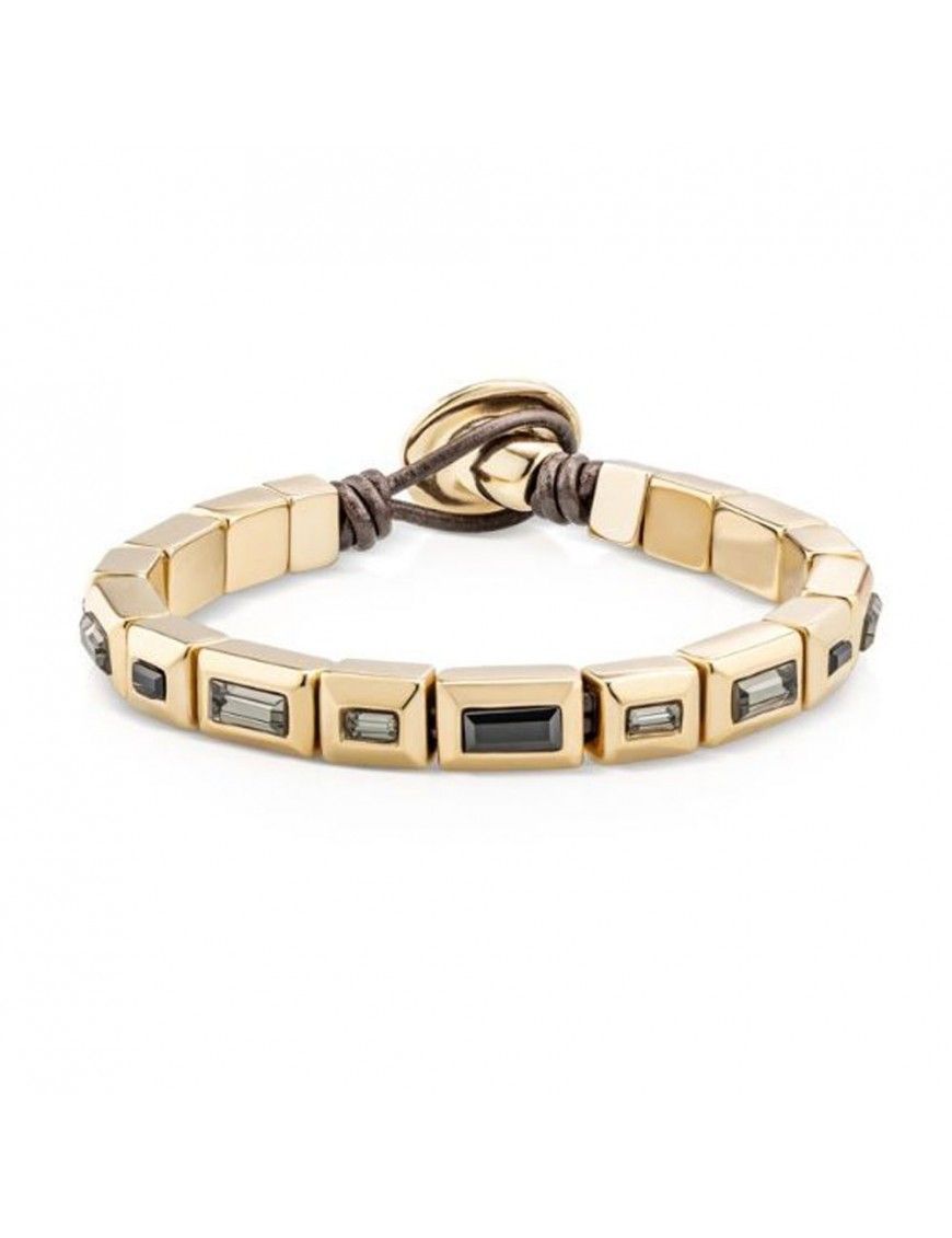 Pulsera Uno De 50 Glitter By Glitter PUL1968NGRORO0M, de metal bañado en color dorado, cristales facetados multicolor y cuero.