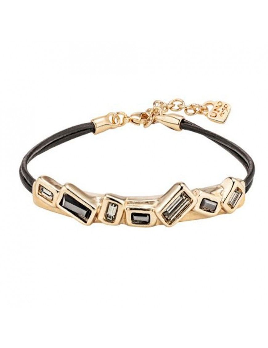 Pulsera Uno De 50 Divine PUL1976NGRORO0M, de metal bañadoe n color dorado, cristales facetados y cuero. Ajustable con cierre de mosquetón. Longitud de 16cm.