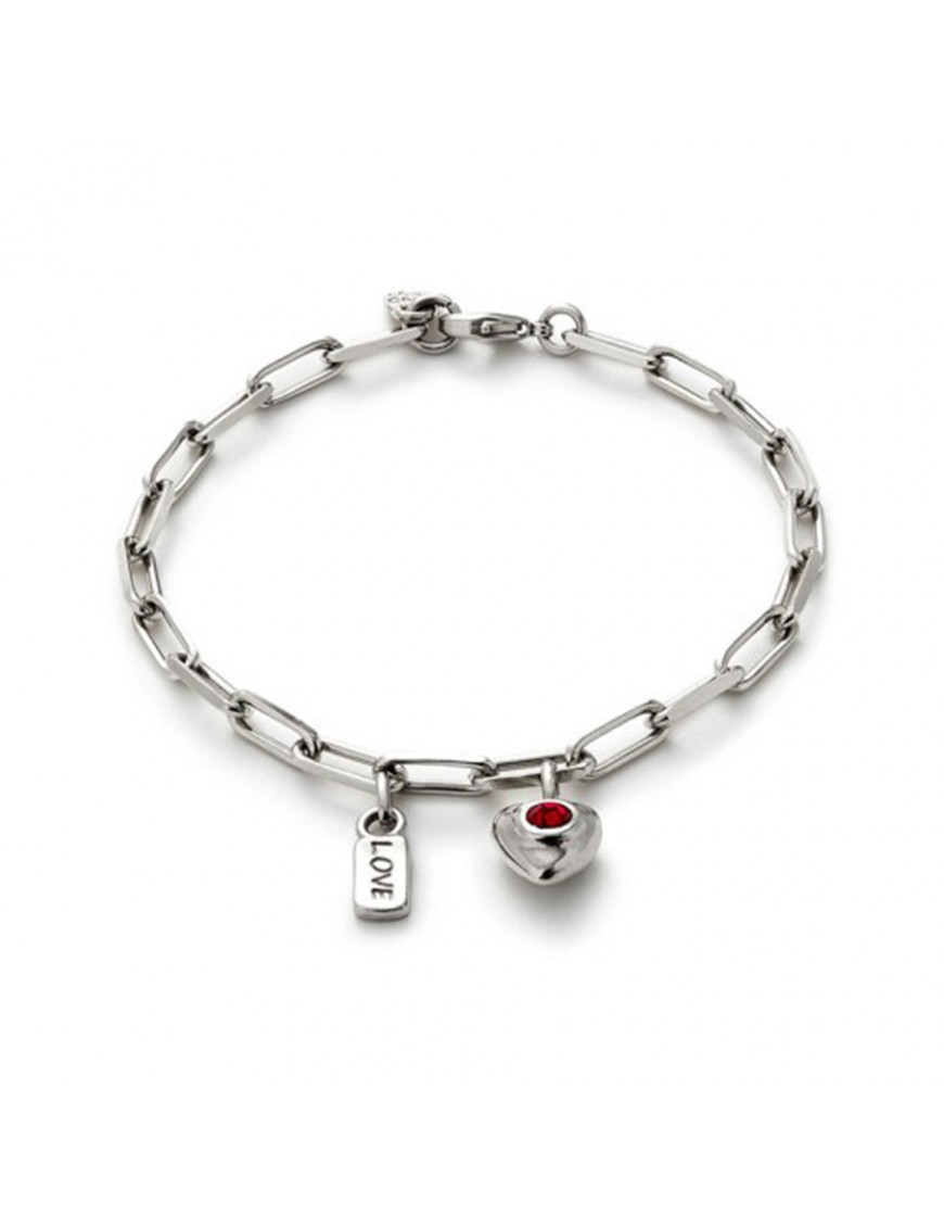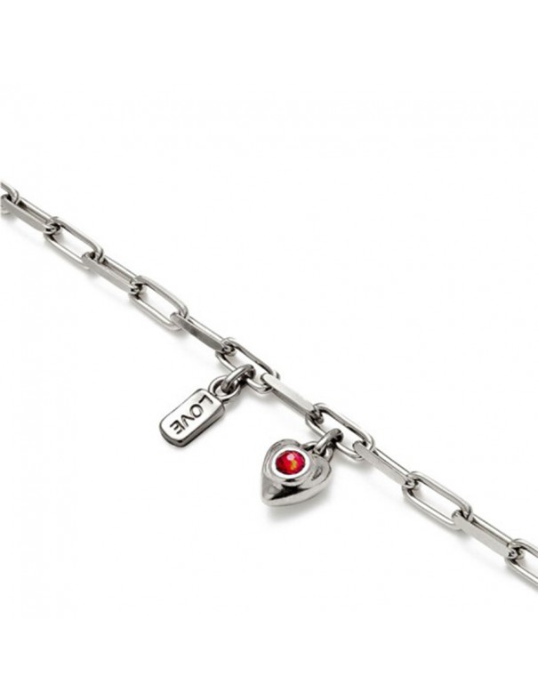 Pulsera Ser Único Eslabones y Dos Colgantes PUL2567ROJMTL0M. Fabricada en España con aleación de metales bañada en plata de ley con pulsera formada por eslabones de los que cuelgan un corazón con un cristal en color rojo y una chapa con la palabra "love" inscrita. Garantía de 3 años.