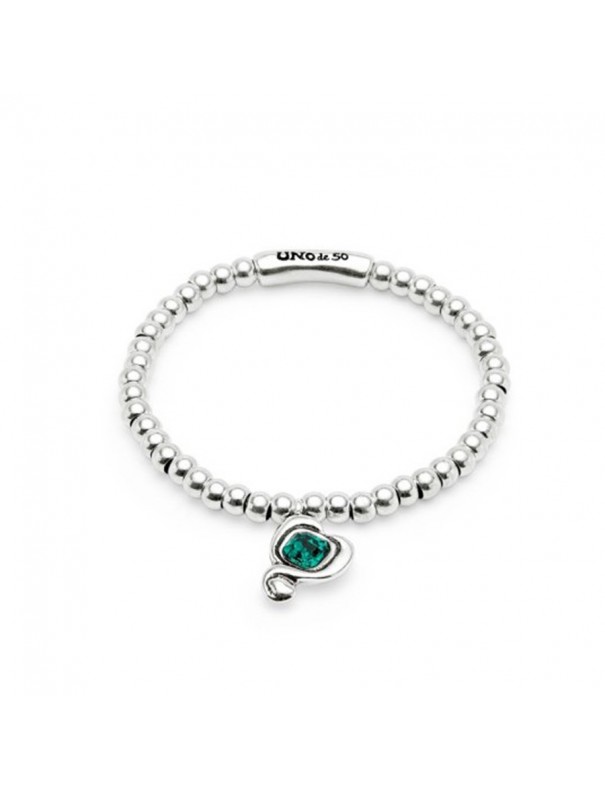 Pulsera Ser Expresiva Baño Plata y Cristal Verde PUL2514VRDMTL0M. Fabricada en España en aleación de metales con baño en plata de primera ley con pulsera formada por bolas adornadas con un corazón irregular con cristal facetado en color verde en el medio. Garantía de 3 años.