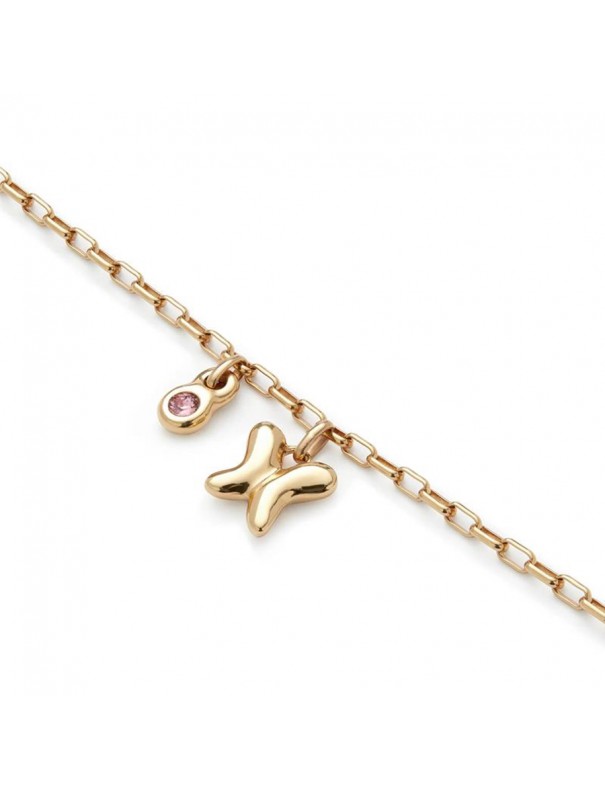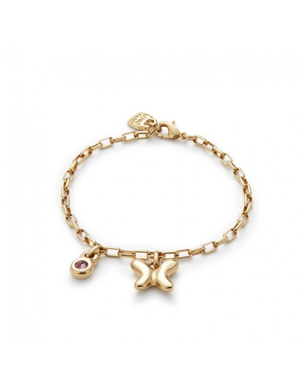 Pulsera Ser Único Baño Oro 18k Mariposa y Cristal Morado PUL2570MORO0M. Fabricada en España en aleación de metales con baño en oro de 18k con pulsera formada por eslabones y dos colgantes de mariposa y cristal facetado en color morado. Presenta cierre de mosquetón. Garantía de 3 años.