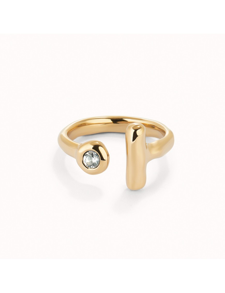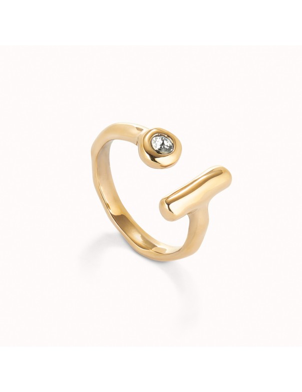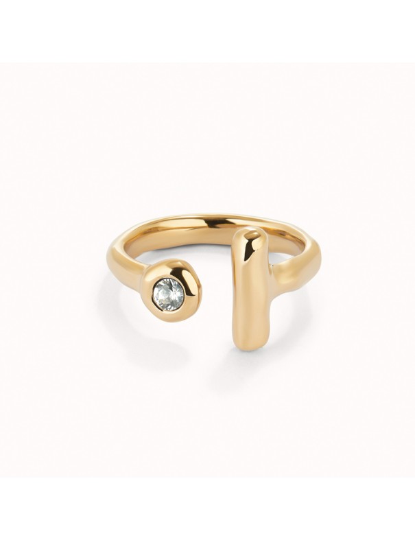 Anillo Abierto Bañado en Oro18k con Topacio Blanco ANI0817BLNORO15. Fabricado en España en metal con baño en oro de 18k. Presenta una forma abierta con una barra en un lado y un topacio blanco en el otro. Es una talla 15.