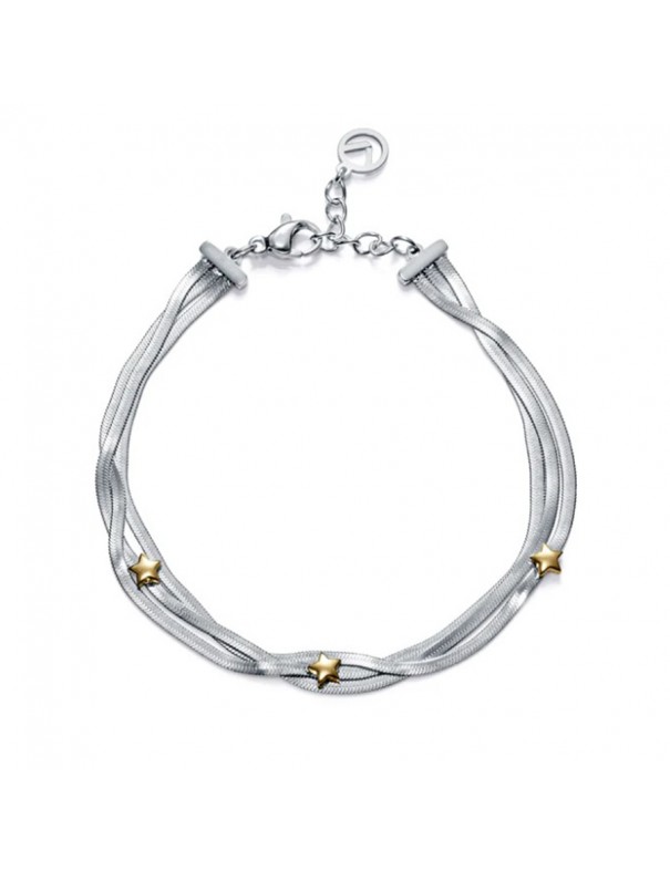 Pulsera Viceroy Acero Cadena de Serpiente Plana Múltiple con Estrellas Doradas 14320P01000. Fabricada en acero con acabado IP dorado bicolor, compuesta por múltiples cadenas tipo “serpiente plana” entrelazadas. Incluye pequeñas estrellas decorativas a lo largo de la pieza. Su forma es de brazalete ajustable con cierre de mosquetón y mide aprox. 17,5 cm + 2 cm de extensión.