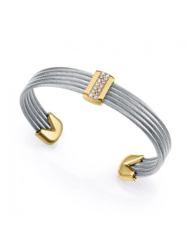 Pulsera Viceroy Mujer Acero Dorado Circonitas 15193P01000. Pulsera de acero con chapado IP dorado, compuesta por varios cables metálicos unidos por una barra central también dorada, con decoración de circonitas transparentes en la parte frontal, lo que le añade un toque elegante y brillante. Es rígida —ideal para muñeca de mujer— con diseño moderno y sofisticado.
