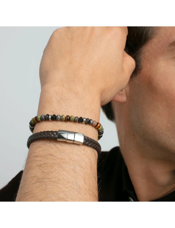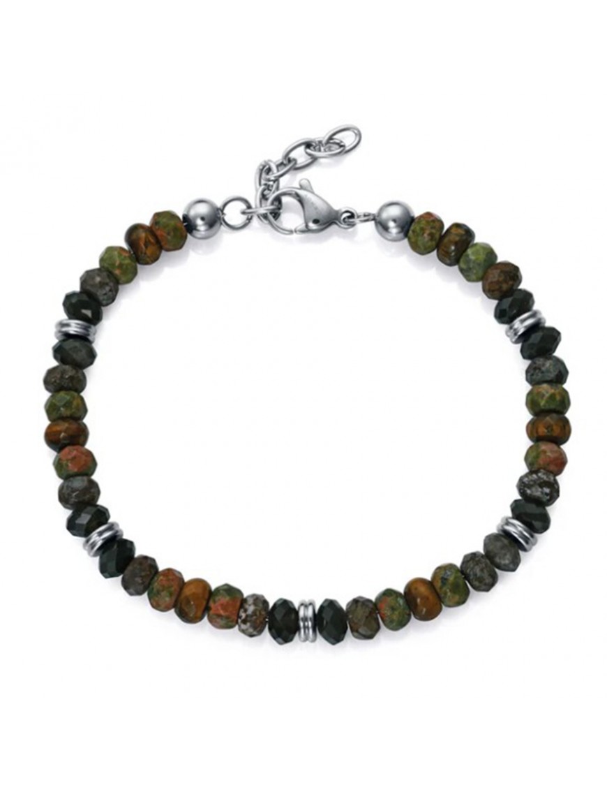 Pulsera Viceroy Acero y Piedras Naturales 14314P01011. Fabricada en acero combinado con piedras naturales de distintos tonos (unakita, ojo de tigre, obsidiana y copo de nieve), de color predominantemente multicolor por las piedras. Tiene forma de brazalete regulable con cierre de mosquetón, y su longitud es 19,5 cm + 3 cm.