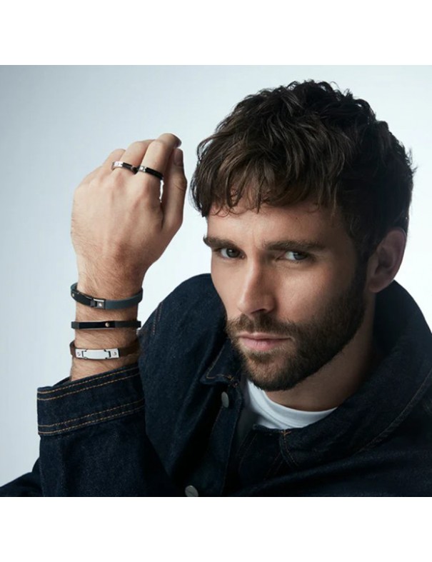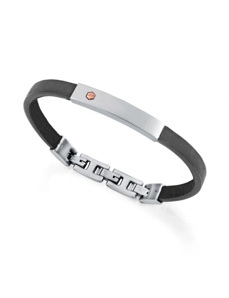 Pulsera Viceroy Hombre Acero y Piel Negra con Tornillo de Oro Rosa 9K 6487P01010. Pulsera para hombre fabricada en acero inoxidable con piel negra, con una placa central metálica rematada por un tornillo de oro rosa 9 kt. Su largo ronda los 21,5 cm, con cierre desplegable que asegura un ajuste cómodo y seguro.