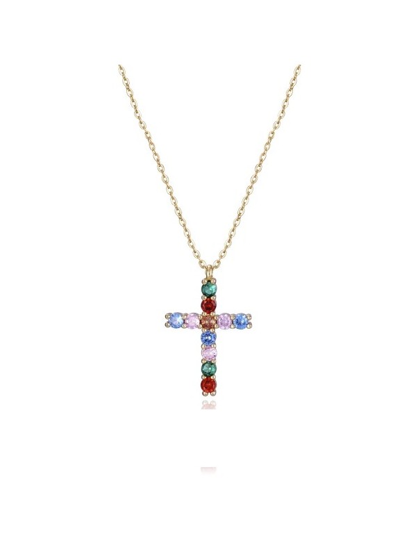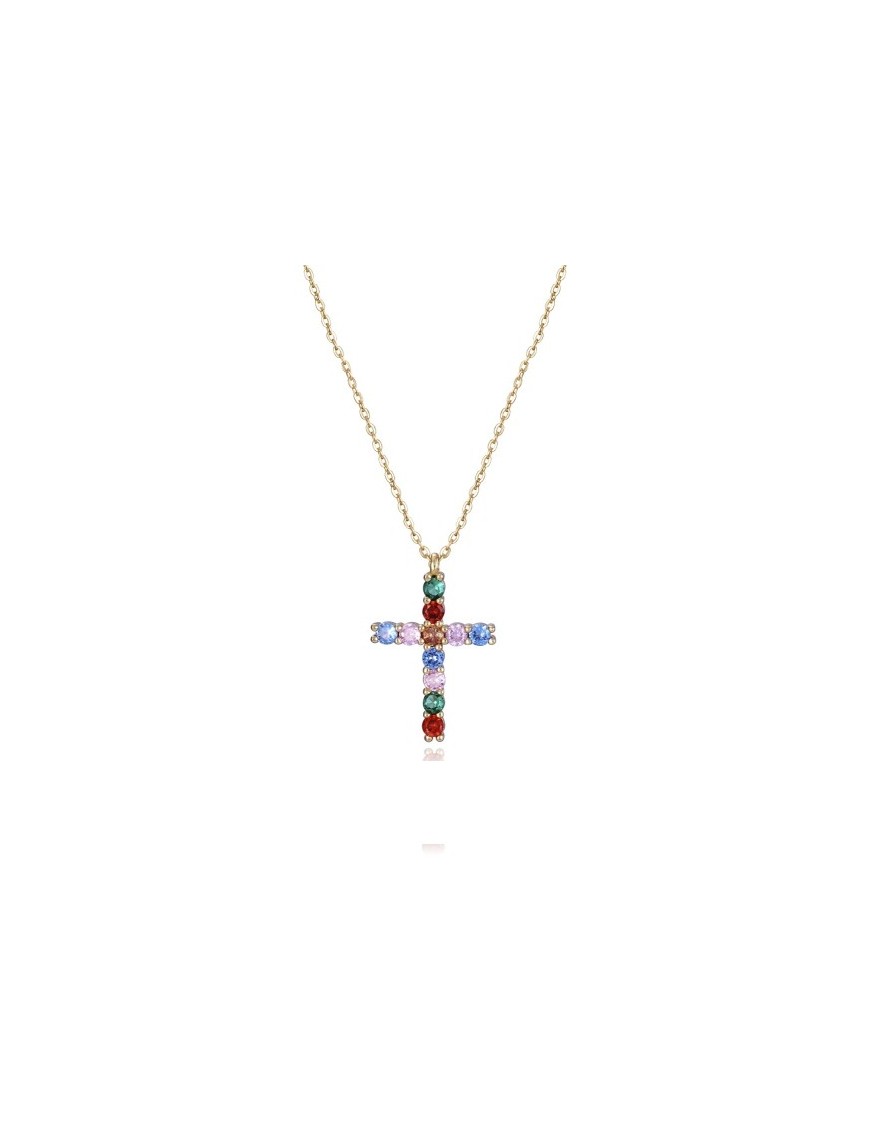 Collar Viceroy Plata Cruz con Baño en Oro y Circonitas 13189C100-39. Fabricado en plata de primera ley con baño en oro. Tiene forma de cruz decorada con circonitas de colores.
