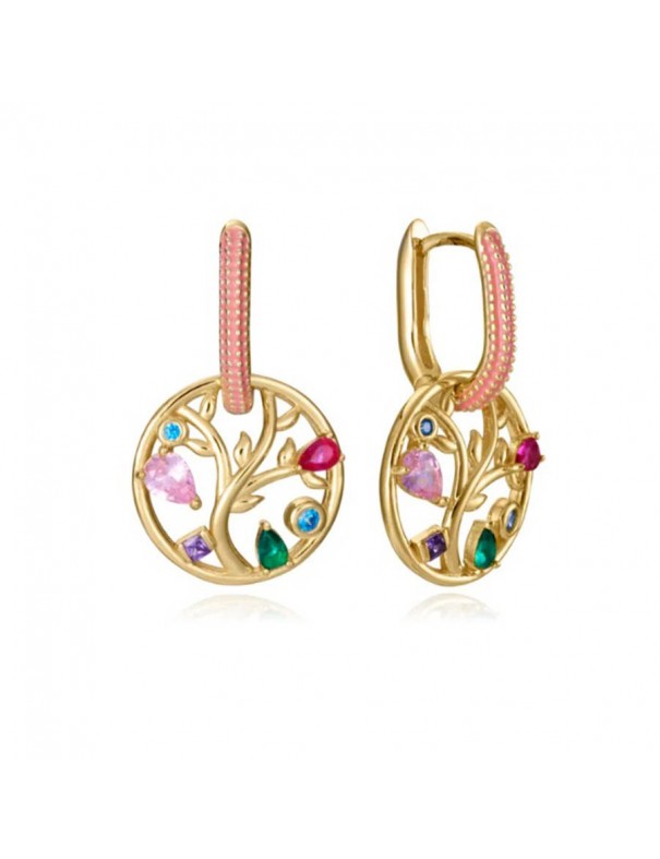 Pendientes Plata Viceroy con Baño en Oro y Árbol de la Vida 15125E100-39. Fabricados en plata de primera ley bañados en oro con aro adornado en esmalte rosa del que cuelga un colgante del árbol de la vida decorado con circonitas de colores.