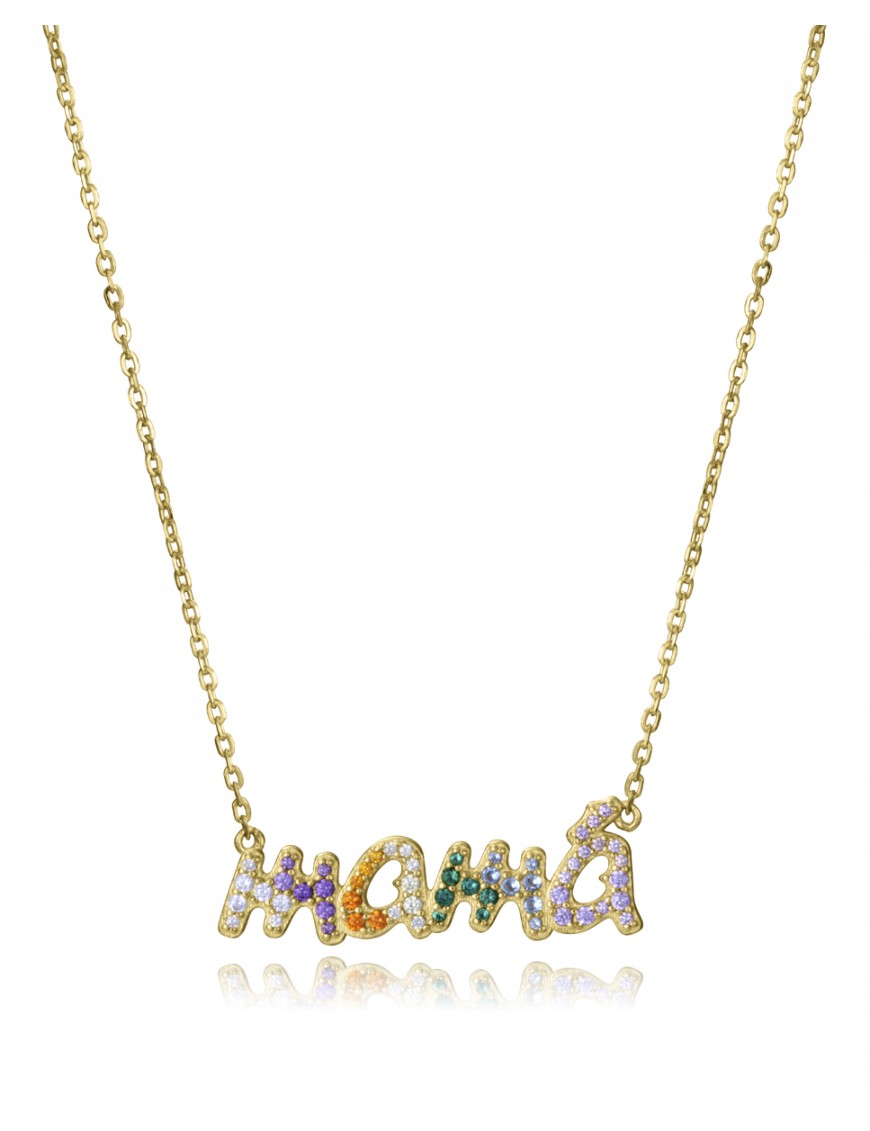 Collar de Plata de Primera Ley con Baño de Oro "Mamá" 2340C100-39. Collar fabricado en plata de primera ley con baño en oro. Presenta la palabra "Mamá" adornado con circonitas de colores. Tiene un largo de 42cm con 3cm de extensión.